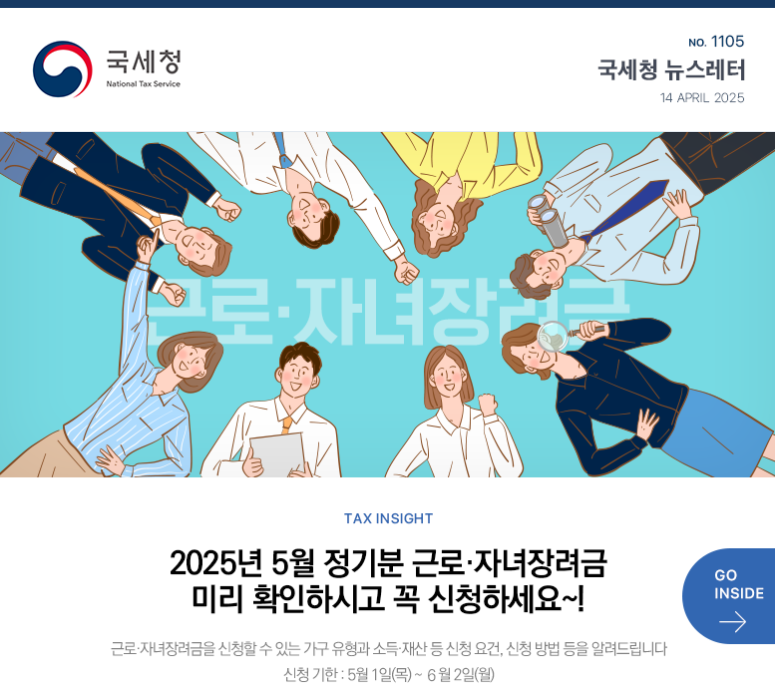 국세청은 2025년 5월 1일부터 5월 31일까지 정기분 근로·자녀장려금 신청을 접수합니다.