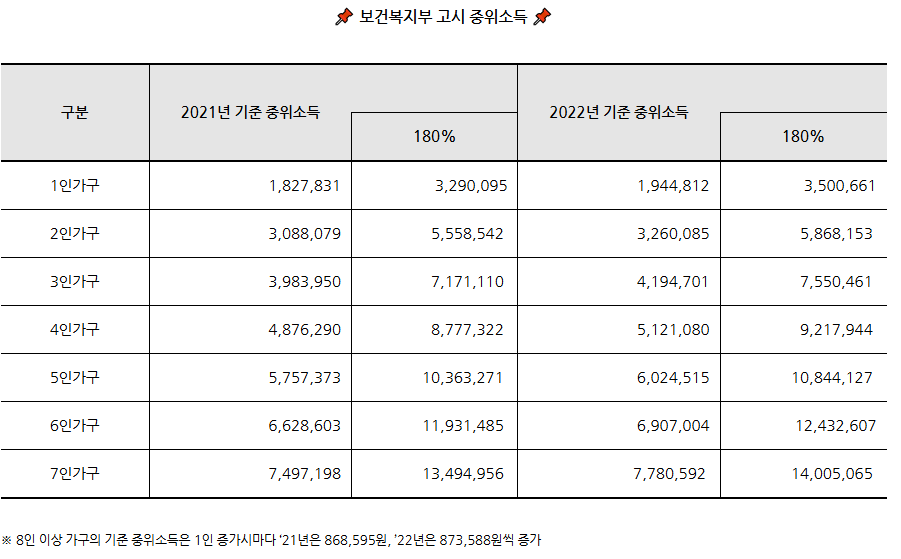 - 가구소득: 가구원 수에 따른 기준 중위소득의 250% 이하